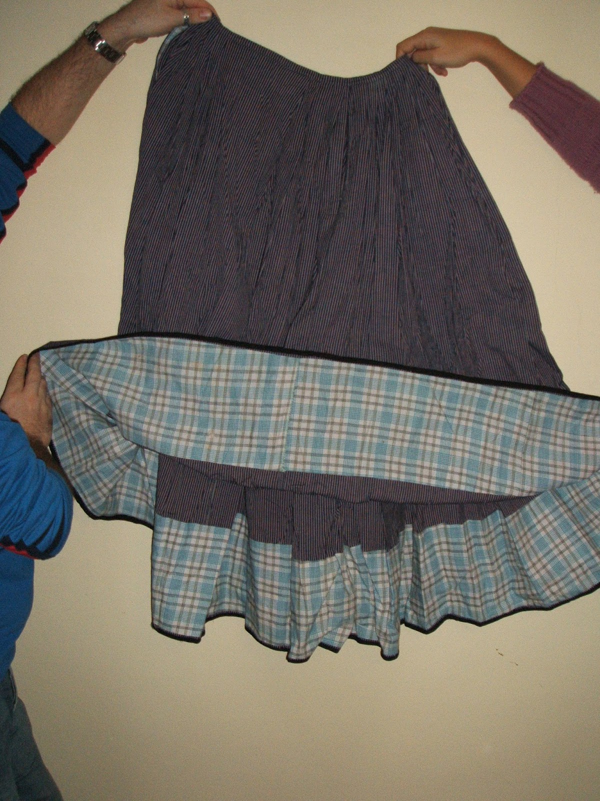Totes aquestes faldes han estat conservades per la mateixa família. Tanmateix, són precisament les faldes una de les peces que més difícilment s'ha conservat, perquè sovint s'ha aprofitat la gran quantitat de tela d'una falda per a fer unes altres peces. Ací tenim una falda en cotó estampat, anomenat indiana, reaprofitat per a fer una faldeta infantil: